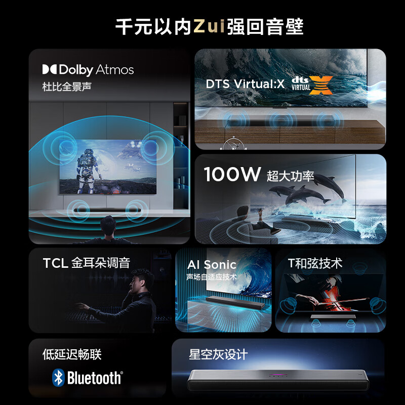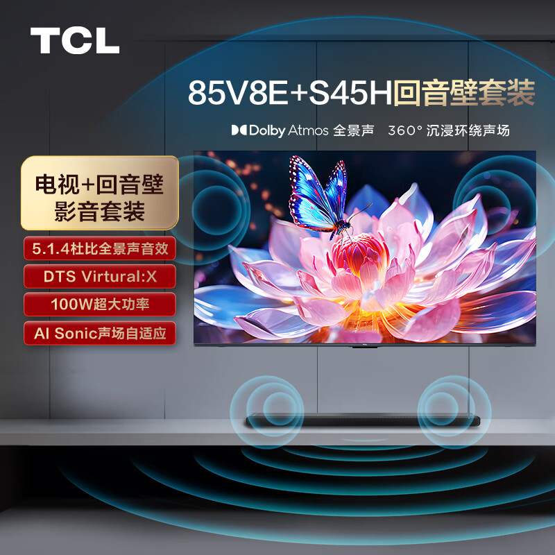 TCL音响套装-85V8E 85英寸 120Hz巨幕影院 V8E+杜比全景声回音壁 S45H价格:5398.00元!