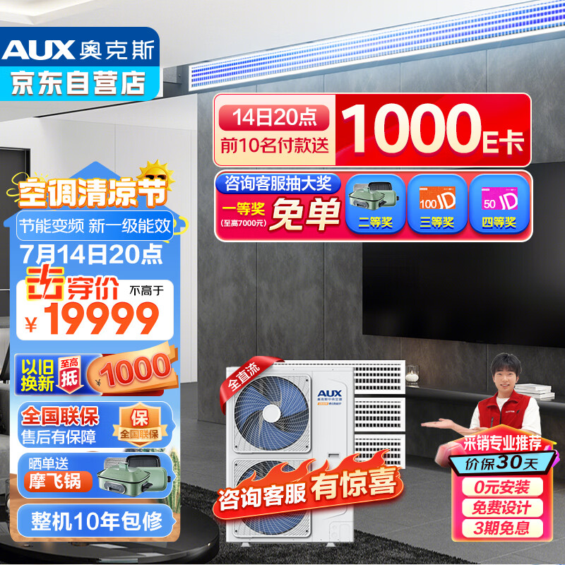 奥克斯(AUX)中央空调5匹一拖三家用多联机 风管机 全直流一级变频包安装嵌入式空调DLR-120W/DCJ2S-JM价格:19999.00元!