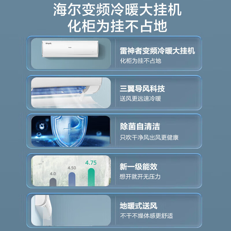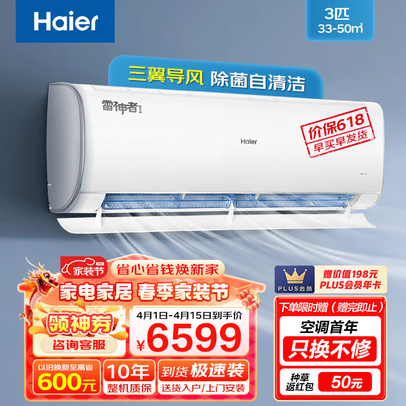 海尔(Haier)空调新一级能效雷神者 挂机3匹壁挂式变频冷暖 防直吹3D除菌舱 自清洁节能卧室客厅空调 72KEA81价格:6599.00元!
