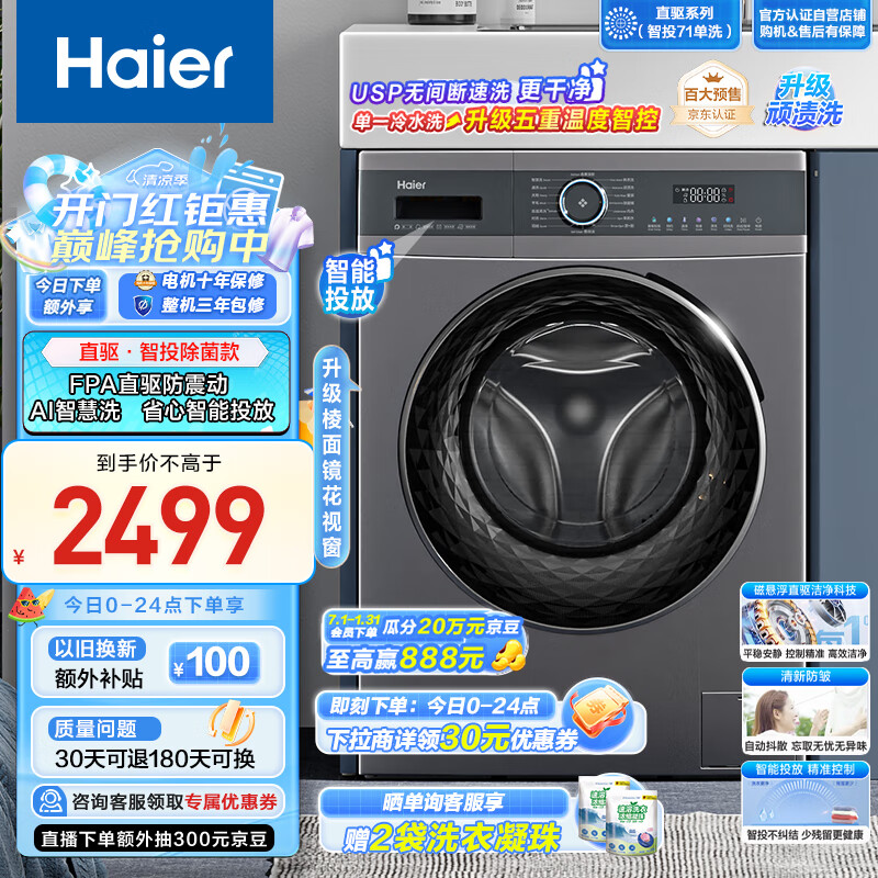 海尔(Haier)滚筒洗衣机全自动单洗 家用10公斤大容量【直驱EG100MATE71S】内衣洗 一级能效 排名前10 以旧换新价格:2499.00元!