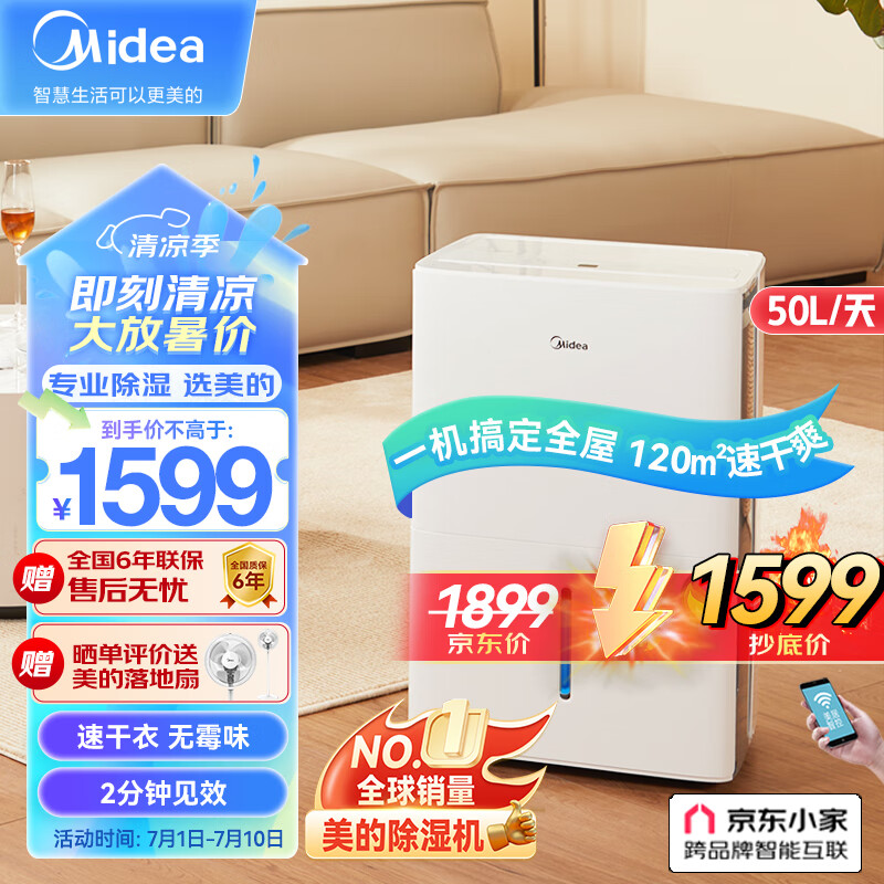 美的(Midea)除湿机/抽湿机 京东小家智能生态 除湿量50升/天 App智控 地下室别墅商用工业吸湿器CF50BD/N7-DP5价格:1899.00元!