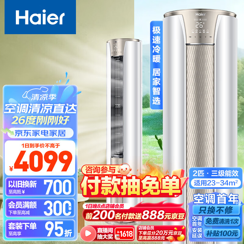 海尔(Haier)2匹 静悦 变频新能效 客厅圆柱空调立式柜机自清洁 立式空调 KFR-50LW/06KCA83U1 以旧换新价格:4099.00元!