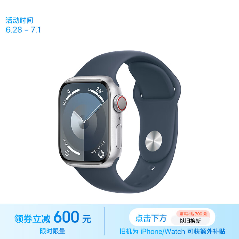 Apple/苹果 Watch Series 9 智能手表GPS+蜂窝款41毫米银色铝金属表壳风暴蓝色运动型表带S/M MRJL3CH/A价格:3799.00元!