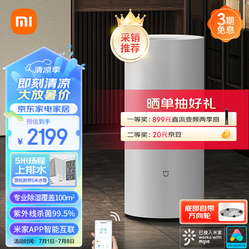 米家小米 除湿机 抽湿机 除湿量50升每天 家用地下室复式别墅商用工业吸湿器 干衣机 APP智能互联价格:2199.00元!