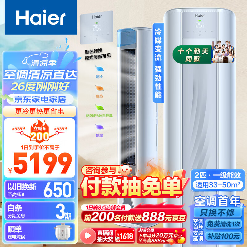 海尔(Haier)2匹 劲爽·荣耀 新一级能效 变频 快速冷暖 自清洁 家用客厅空调立式柜机 KFR-50LW/A1FAA81U1价格:5199.00元!