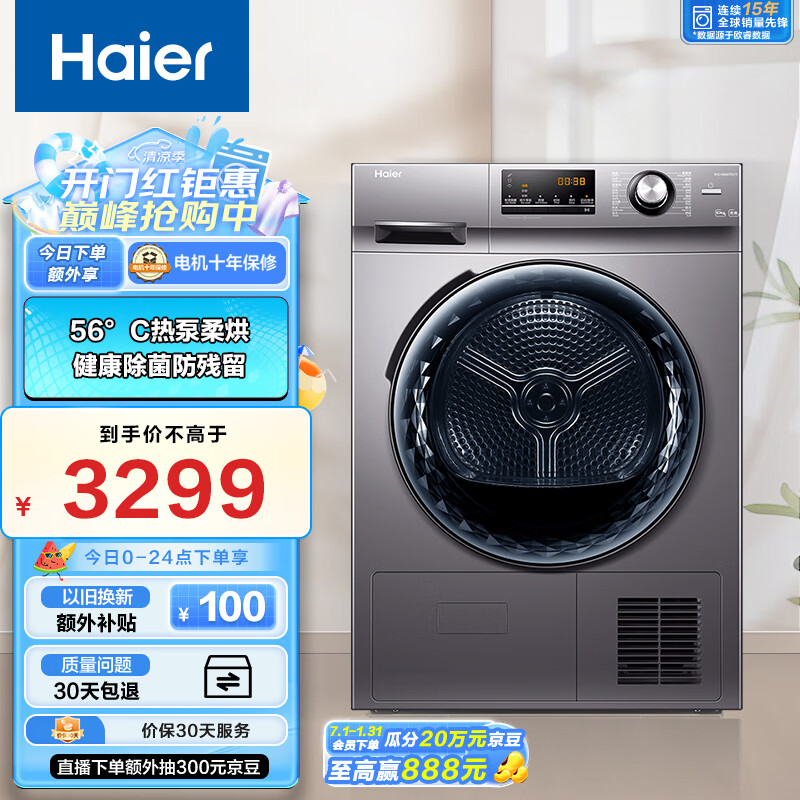 海尔(Haier)烘干机家用 10公斤热泵干衣机 烘衣机 速烘节能 除菌除潮除螨 EHG100MATE21S 以旧换新价格:3299.00元!