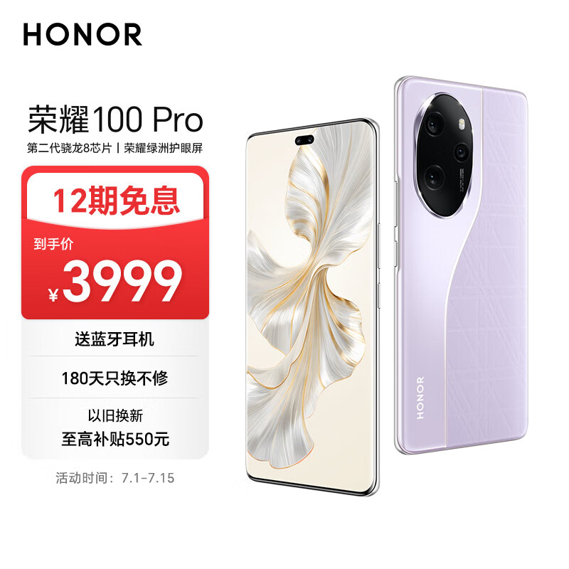荣耀100 Pro 单反级主摄 荣耀绿洲护眼屏 第二代骁龙8旗舰芯片 AI手机 16+512 莫奈紫 5G价格:3999.00元!