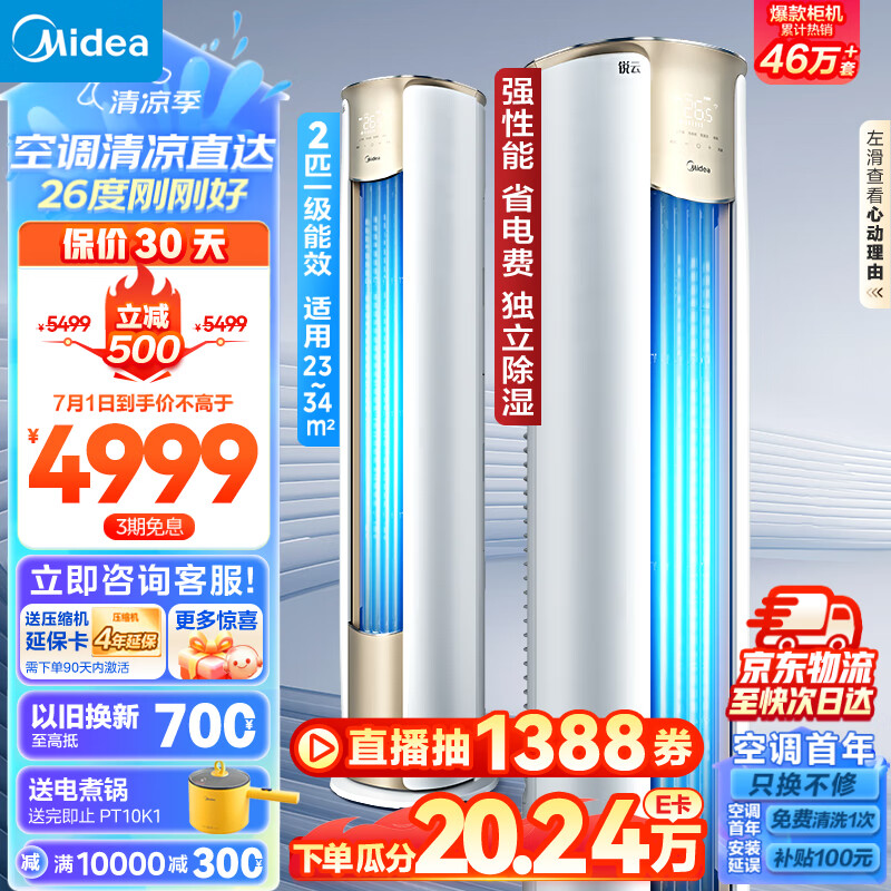 美的(Midea)空调 2匹 锐云2代 新一级能效 变频冷暖 除湿 空调立式 客厅空调柜机KFR-51LW/N8XHA1Ⅱ价格:4999.00元!