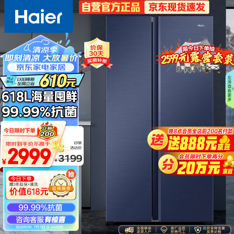 海尔(Haier)618升风冷无霜对开门双开门电冰箱家用一级能效变频节能净味超薄嵌入超大容量BCD-618WGHSSEDBL价格:2999.00元!