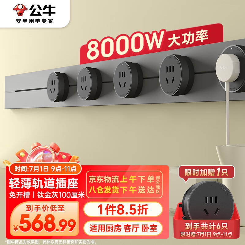 公牛(BULL)明装 轨道插座 大师轻薄款可移动墙壁插座壁挂式插座 免打孔 100厘米轨道+5个五孔 钛金灰价格:669.40元!