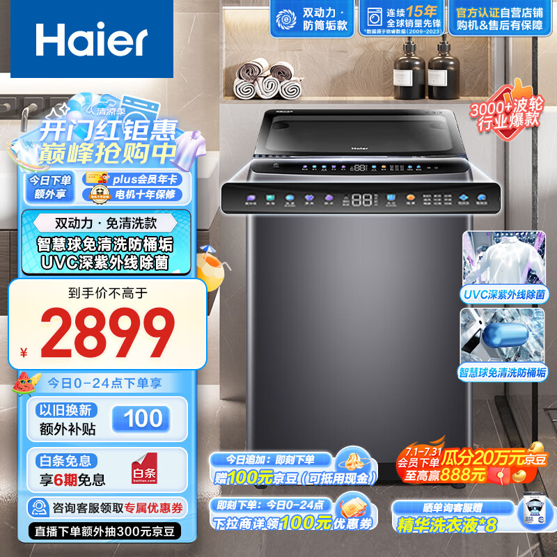 海尔(Haier)波轮洗衣机全自动家用 10公斤大容量 变频一级能效 免清洗 双动力防缠绕 以旧换新EMS100B26Mate6价格:2999.00元!