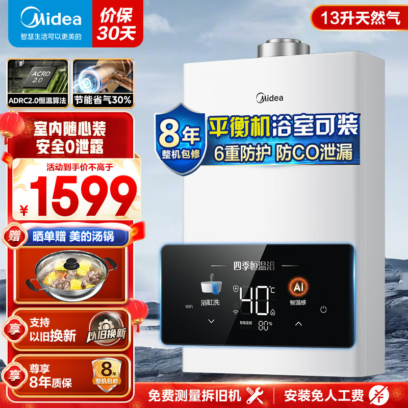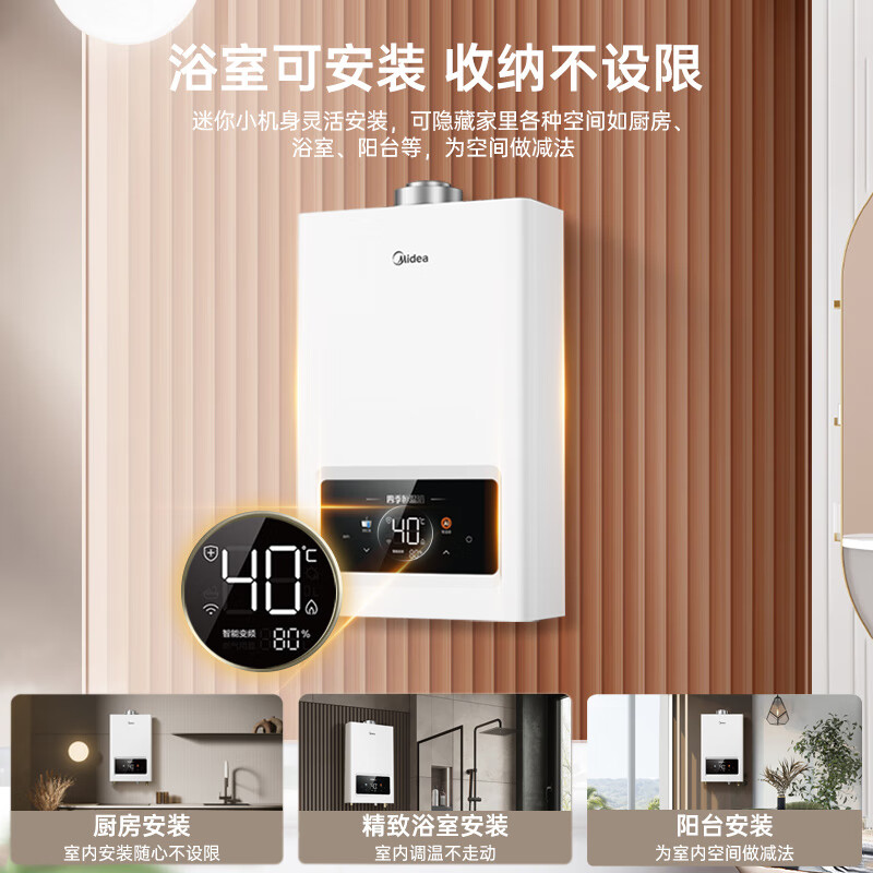 美的(Midea)燃气热水器家用天然气平衡式燃气热水器13升智能变频恒温平衡机可装浴室老人小孩安心家用HC7 恒温沐浴【13升一厨两卫浴缸洗】 浴室可安装价格:1799.00元!