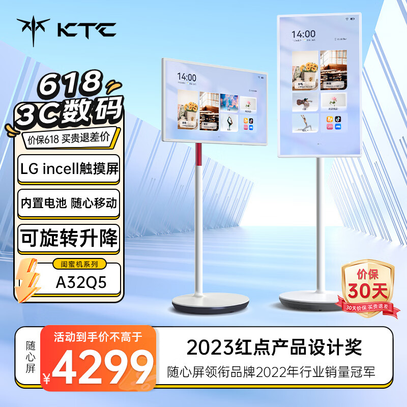 KTC 32英寸闺蜜机青春版 随心屏移动屏 带音响安卓系统无线投屏 大屏触控升降旋转显示器A32Q5价格:4299.00元!