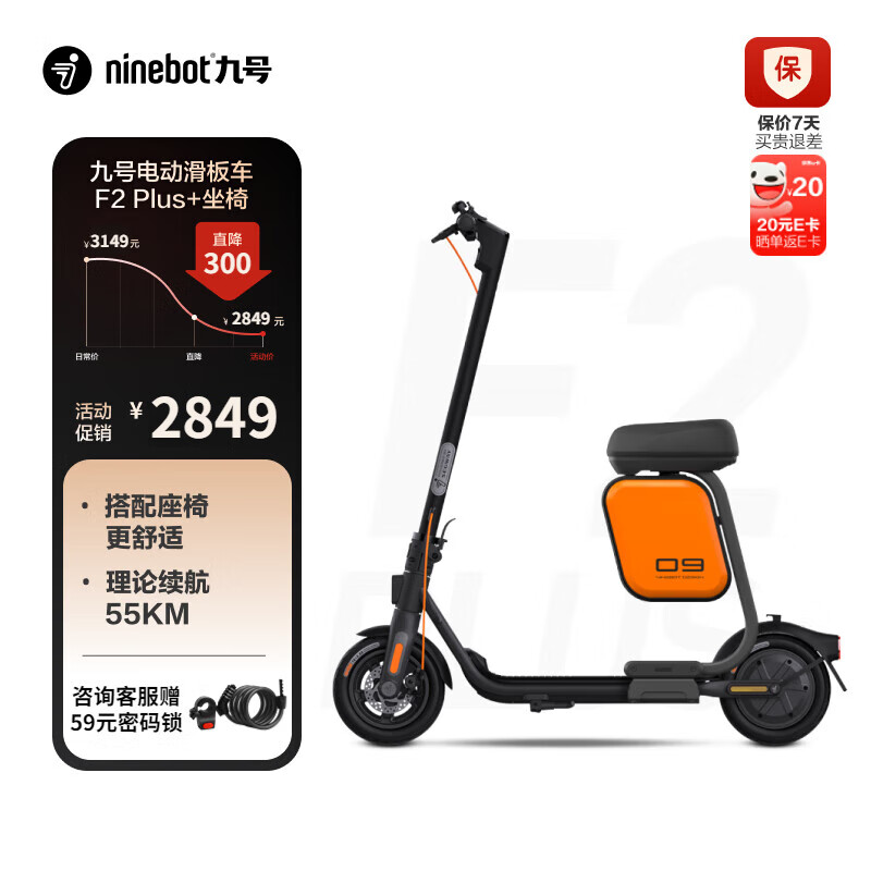 Ninebot九号电动滑板车F2plus+多功能座椅带箱包 成人学生便携智能可折叠电动车果冻胎体感车价格:2749.00元!