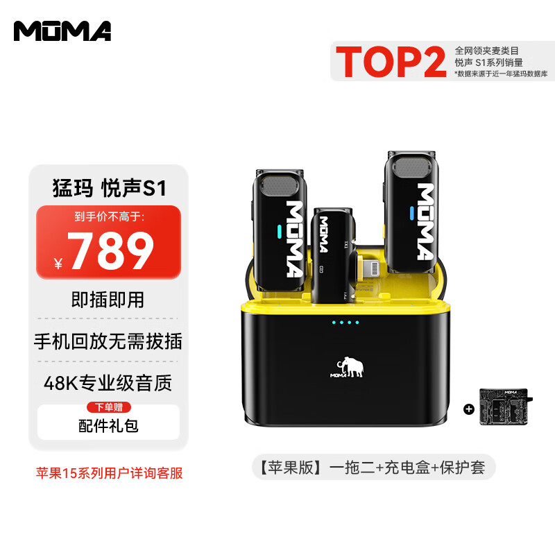 猛玛(MOMA)无线领夹麦克风猛犸悦声S1苹果版一拖二vlog采访户外降噪直播手机收音麦价格:789.00元!