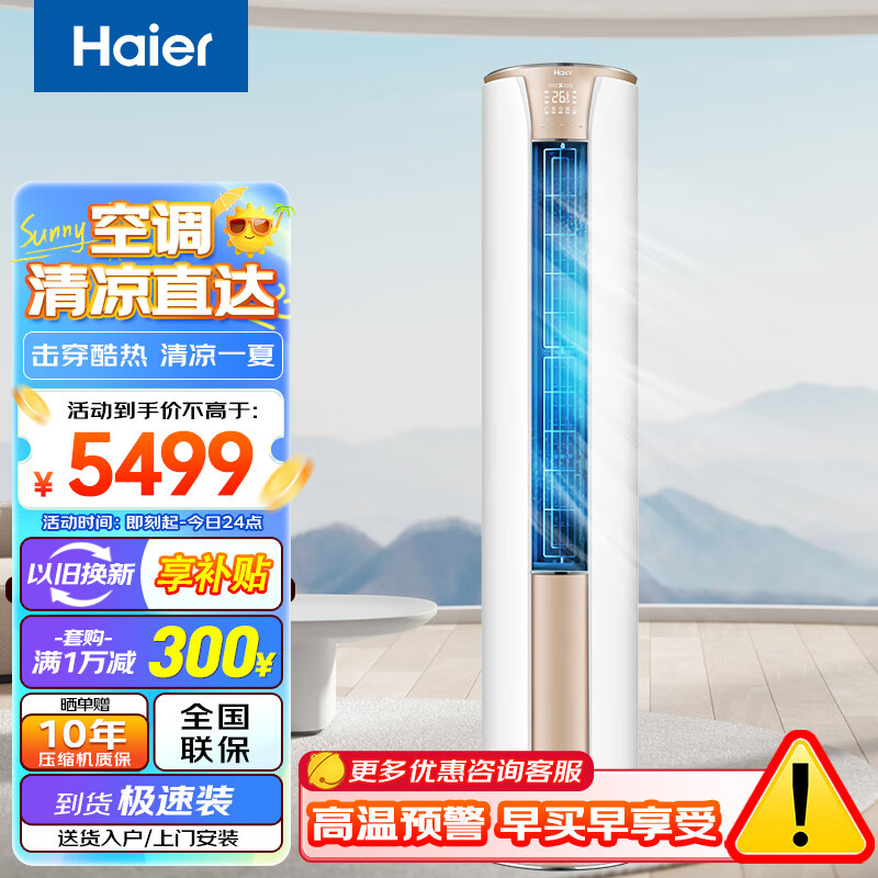 海尔(Haier)空调3匹变频冷暖 新一级能效 自清洁圆柱式家用客厅柜机空调立式 空气净化 除PM2.5 定位送风价格:5499.00元!