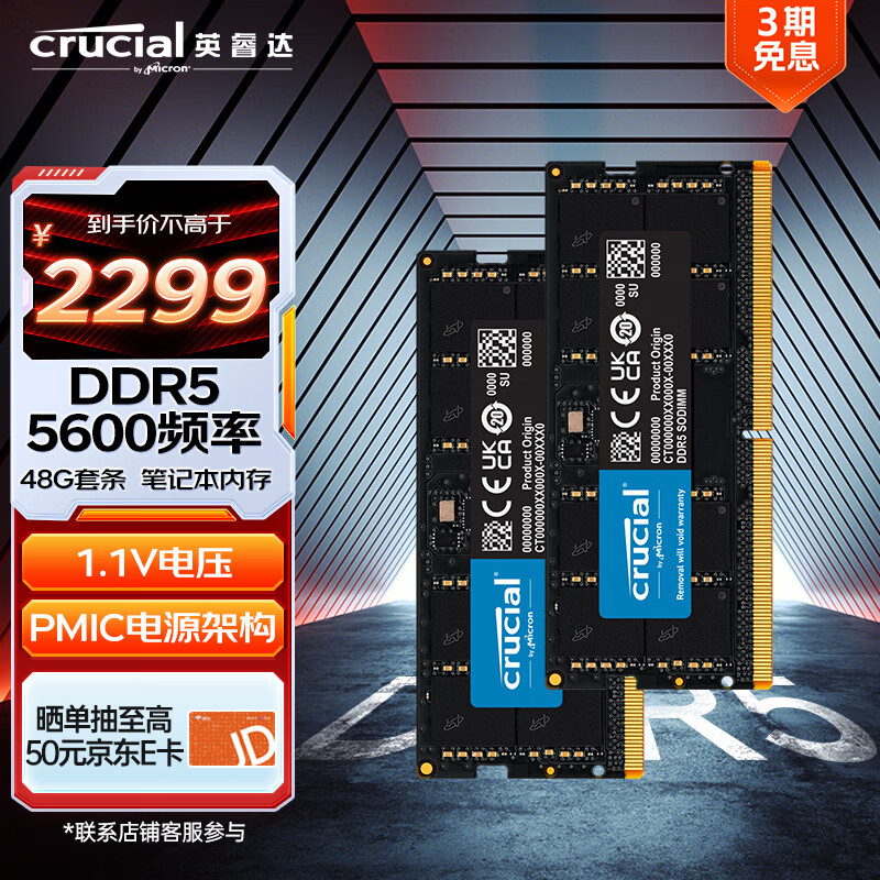 英睿达(Crucial)96GB(48GB×2)套装 DDR5 5600频率 笔记本内存条 美光原厂颗粒价格:2299.00元!