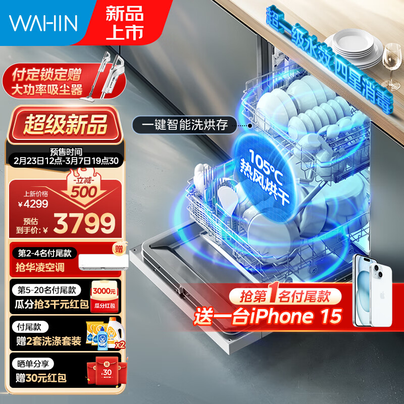华凌14套嵌入式洗碗机升级款AIR10超一级水效一键智洗烘四消毒105℃热风烘干高压清洗自清洁旗舰版价格:3799.00元!