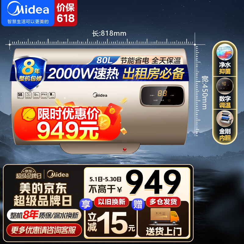 美的(Midea) 80L电热水器储水式数显速热防电墙沐浴高温杀菌大水量家用P3系列3200WF8032-P5(H)价格:949.00元!