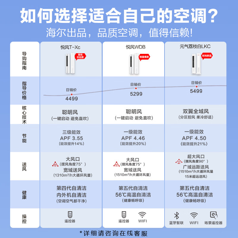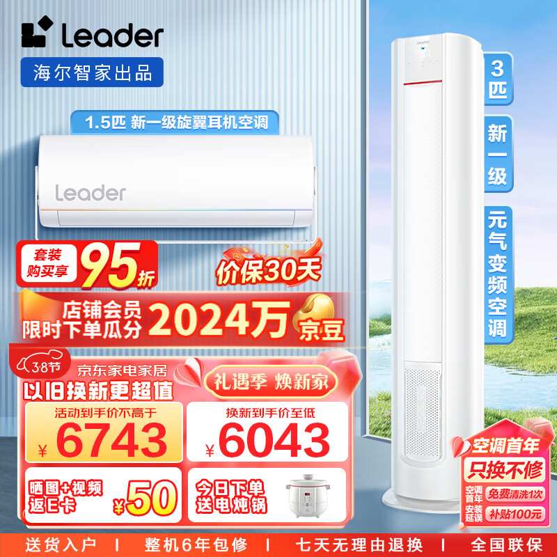 Leader海尔智家出品 新一级变频空调柜挂套装一室一厅1.5匹旋翼挂机35MUE+3匹元气柜机72LKC价格:6743.00元!