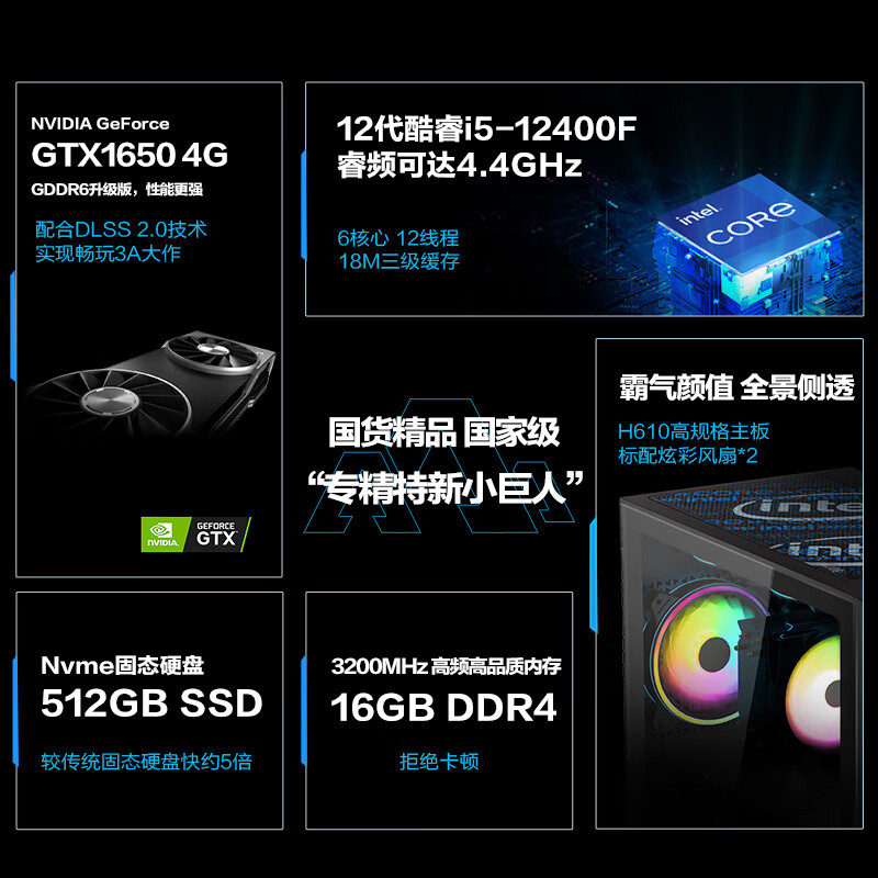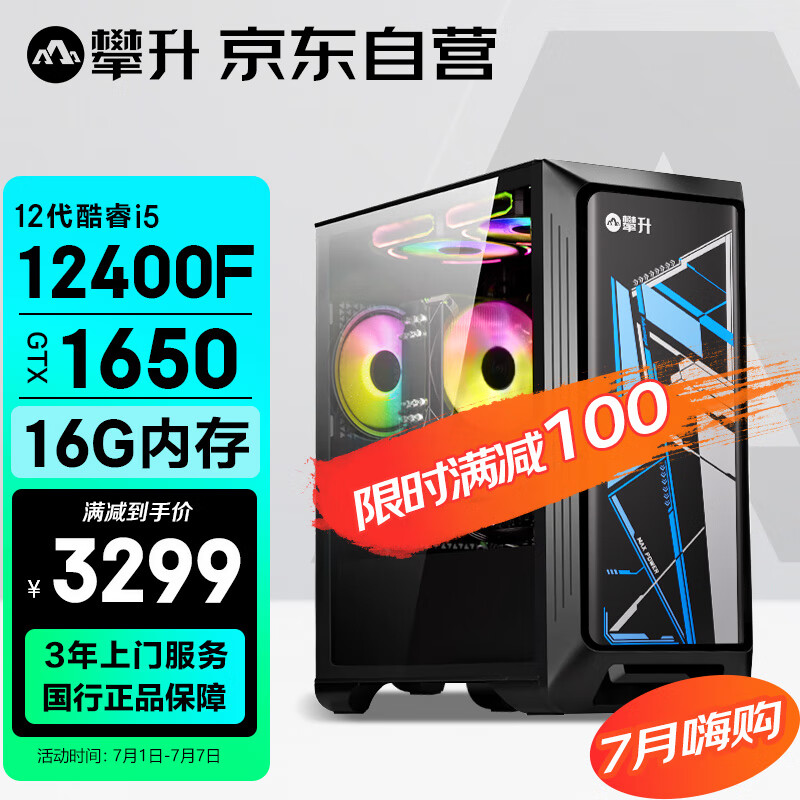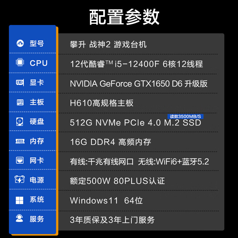 攀升 战神2 台式电脑游戏台式机电脑主机组装电脑主流游戏全套(12代酷睿i5 GTX1650 16G 512G)价格:3399.00元!