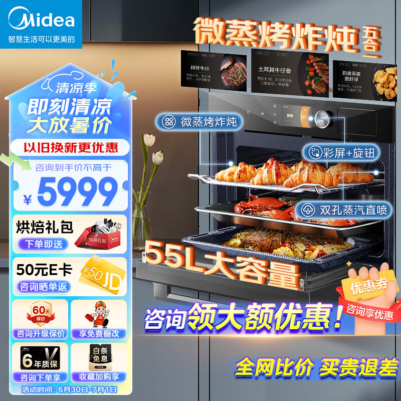 美的(Midea)无边嵌入式微蒸烤箱一体机G5 微蒸烤炸炖5合1 搪瓷内胆55L科技彩屏+旋钮价格:5999.00元!