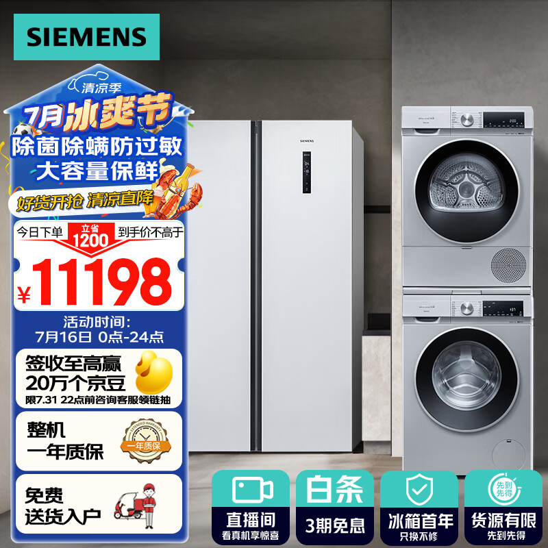 西门子(SIEMENS)冰洗烘套装 502升超薄冰箱+10kg羊毛洗 洗衣机+10kg除菌烘干机 KA50NE20TI+WG52A108AW+WQ53A2D80W价格:11198.00元!