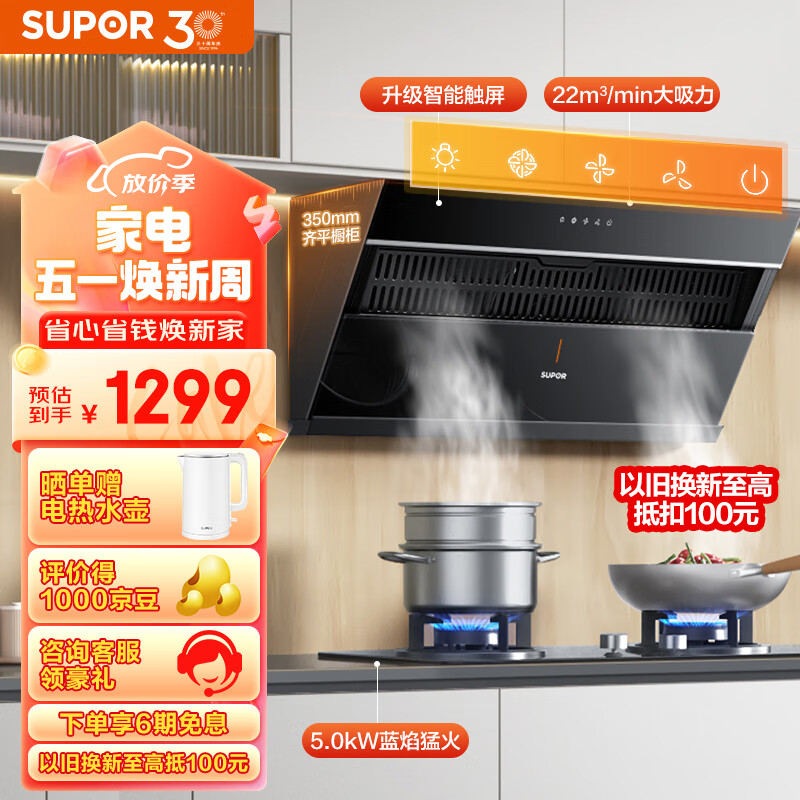 苏泊尔(SUPOR)抽油烟机侧吸式?爆炒22立方大吸力?家用吸油烟机?450pa强劲风压油烟机燃气灶套装?DJ11+DB19S液价格:1299.00元!