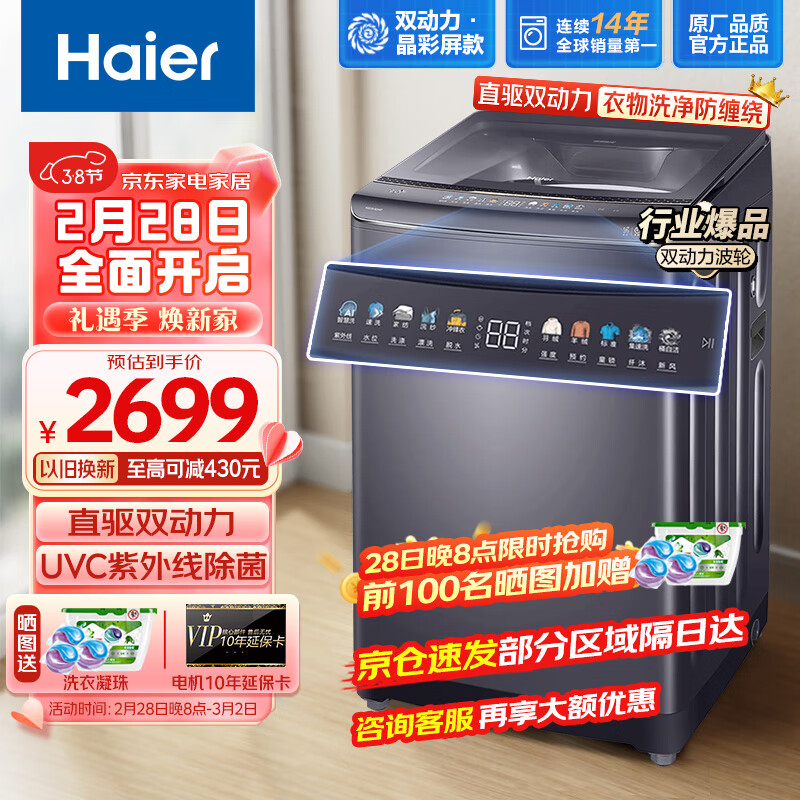 海尔10公斤新风双动力防缠绕波轮洗衣机全自动家用大容量直驱变频一级能效羽绒洗XQS100-BZ368T价格:2899.00元!