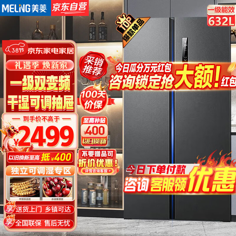 美菱(MELING) 632升对开门一级双变频风冷无霜冰箱双开门低音家用 离子净味 干湿分储 BCD-632WPUCX价格:2699.00元!
