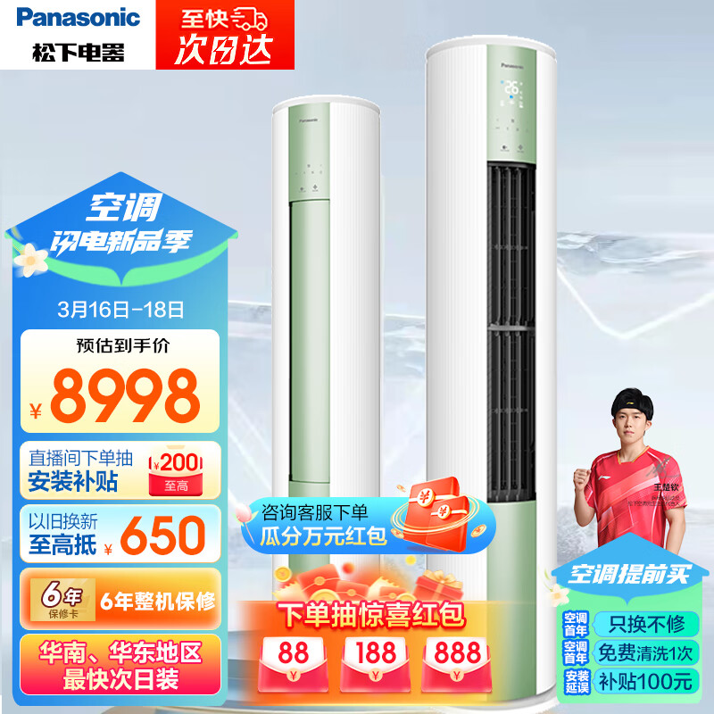 松下(Panasonic)空调 净悦星3匹新一级能效 圆柱立式柜机变频空调 纳诺怡除菌 WiFi 以旧换新 云杉绿ZY72F310G价格:8998.00元!