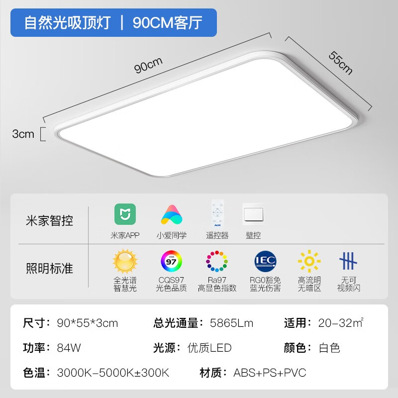 奥克斯(AUX)LED客厅灯简约吸顶灯智控高显指餐厅卧室超薄全屋套餐阳台灯 力荐!米家全光谱护眼90cm客厅价格:666.00元!