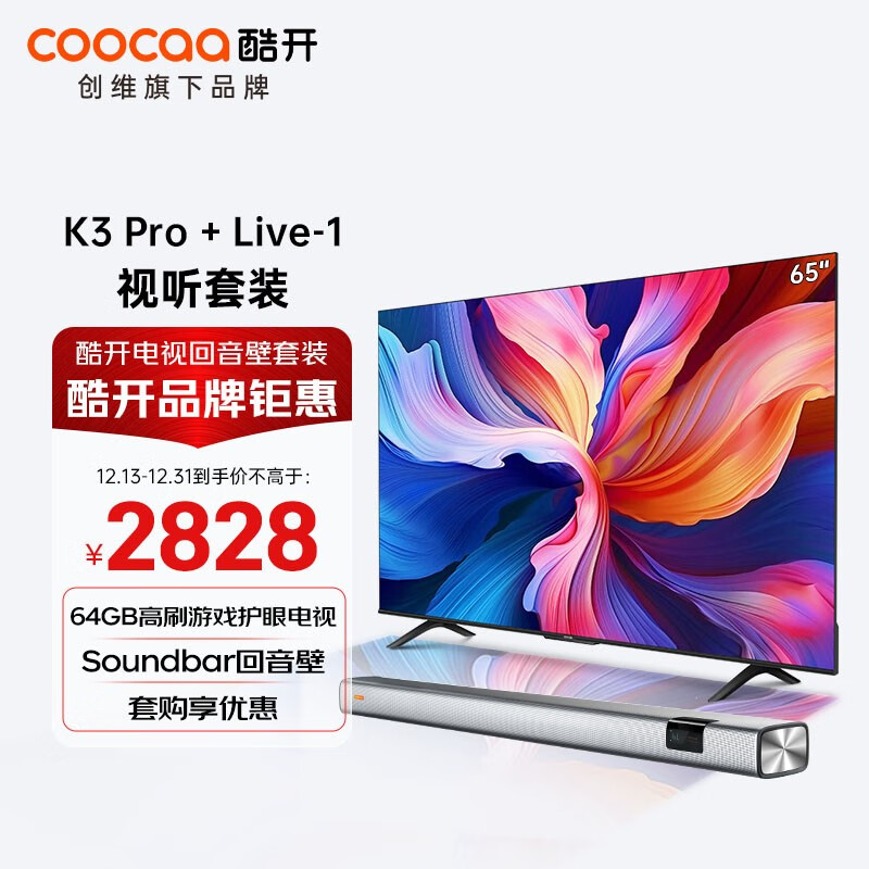 酷开创维 65英寸K3 Pro电视机+音响Live-1 回音壁 客厅家庭影院 壁挂条形音箱 蓝牙影院级娱乐体验套装价格:2828.00元!
