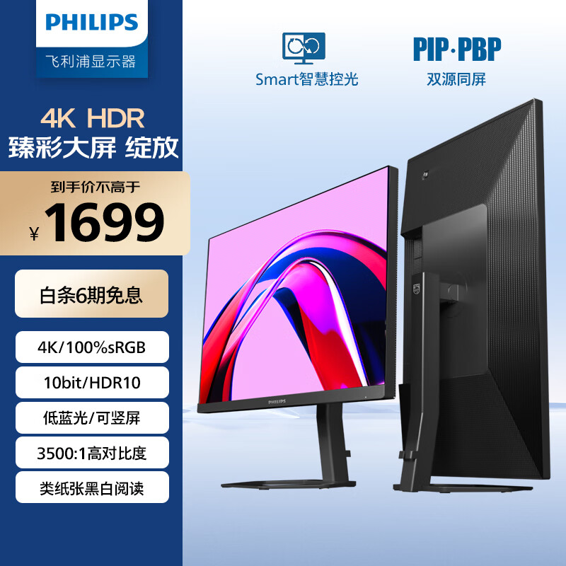 飞利浦 31.5英寸4K 10bit HDR低蓝光 分屏 旋转升降 设计办公显示器 娱乐大屏 电脑显示屏 32E1N5800L价格:1699.00元!