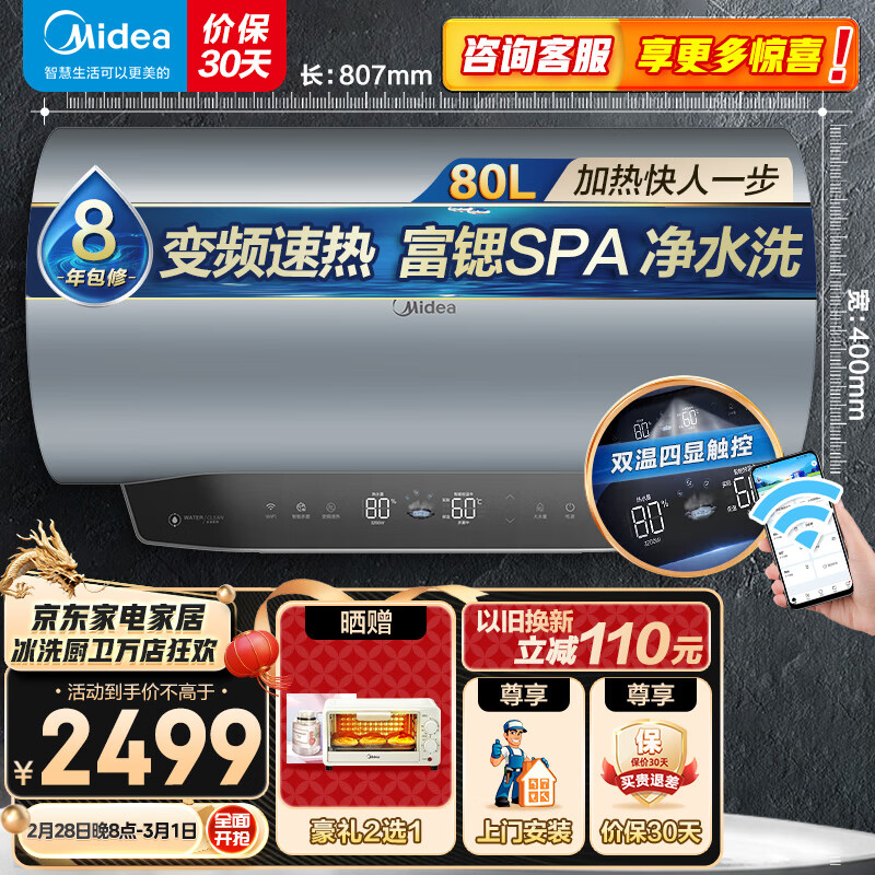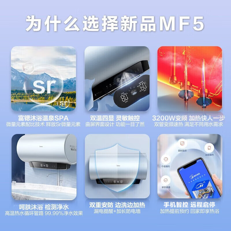 美的(Midea)80升储水式家用电热水器 富锶温泉浴 3200W变频速热 一级能效双重安防远程智控F8032-MF5(HE)价格:2499.00元!