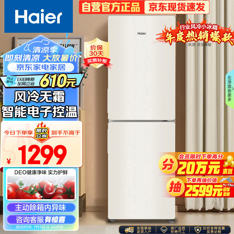 海尔(Haier)190升风冷两门双门节能低噪小型家用电冰箱迷你宿舍租房小巧不占地方以旧换新BCD-190WLHC2Z0L9价格:1299.00元!