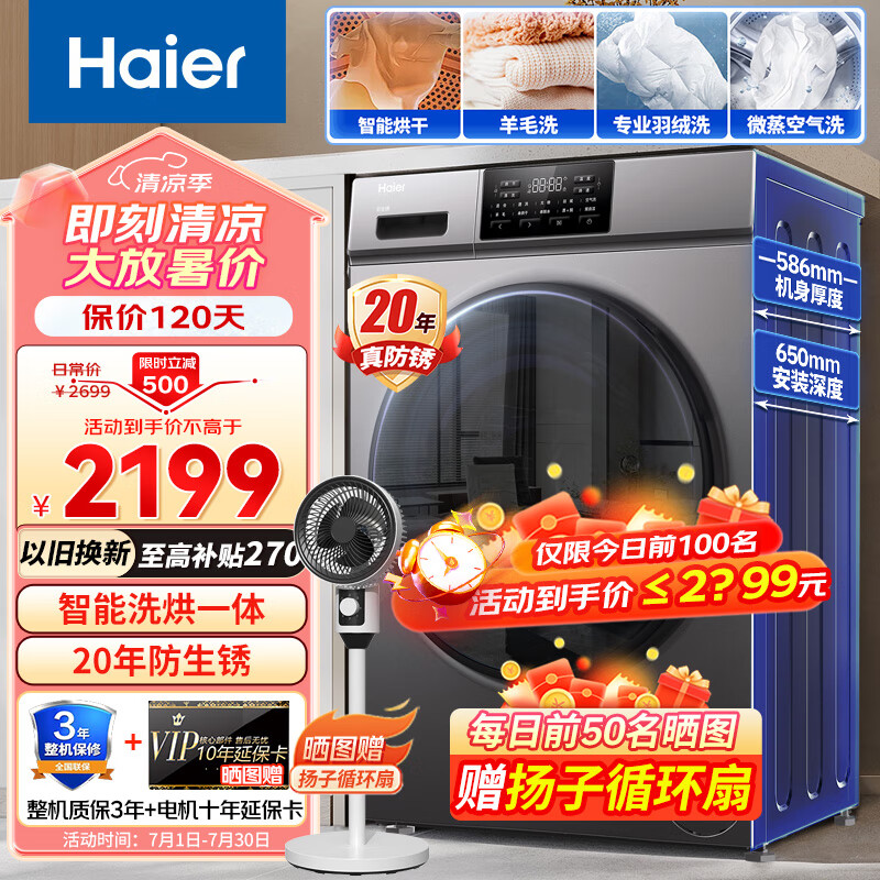 海尔洗衣机烘干机全自动滚筒洗烘一体机10公斤家用大容量一级能效20年防生锈空气洗羽绒洗 以旧换新价格:2298.00元!