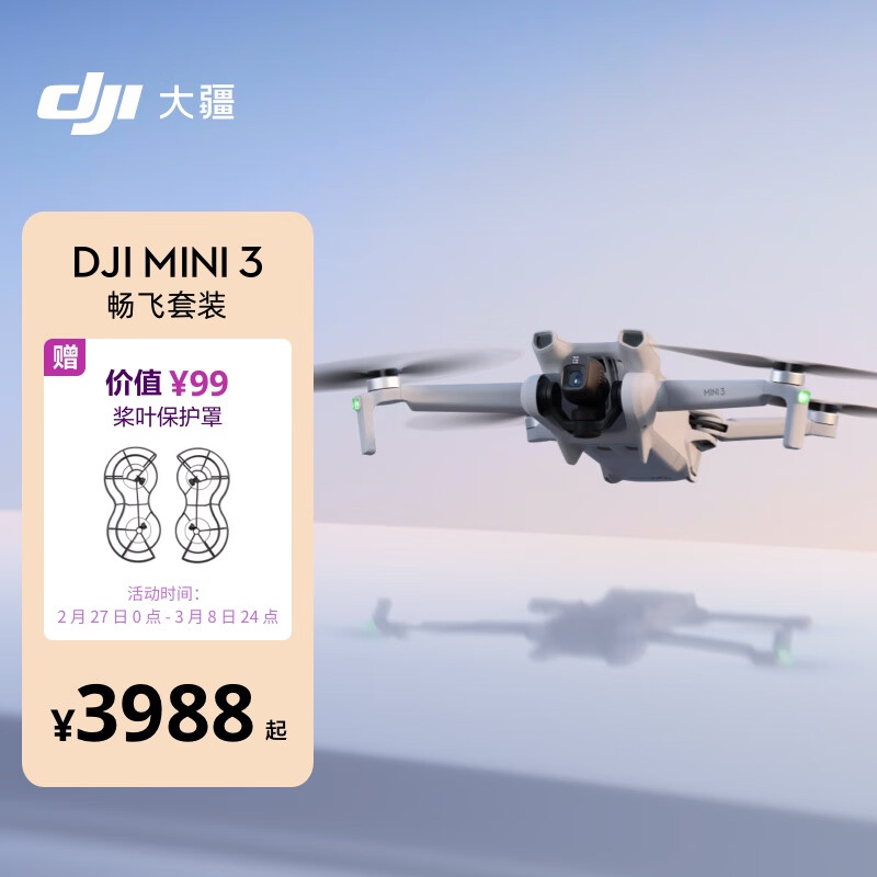 大疆 DJI Mini 3 畅飞套装 优选迷你航拍机 高清拍摄专业小型长续航飞机 大疆无人机+128G内存卡价格:4092.90元!