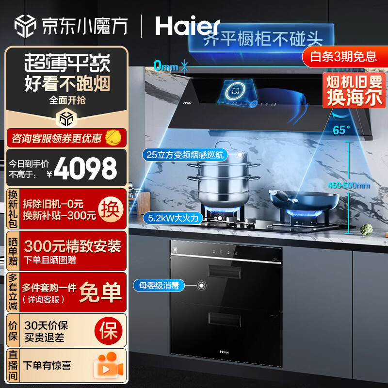 海尔(Haier)平嵌大师系列 烟灶消三件套 25m3/min变频有效风 5.2KW大火力 母婴级消毒C21U1+Q2BE3天+12LCS1价格:4098.00元!