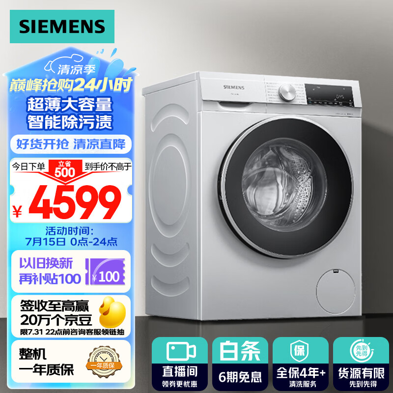 西门子(SIEMENS) 8公斤超薄滚筒小洗衣机全自动 496mm超薄机身 智能除污渍 专业羽绒洗XQG80-WH32A1X00W价格:4599.00元!