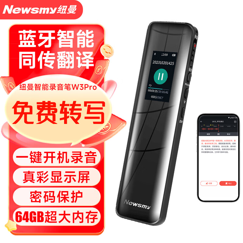 纽曼智能录音笔 W3 Pro 64G 蓝牙版 转写助手 声文速记 专业高清降噪 会议录音转文字 录音器 同传翻译价格:299.00元!