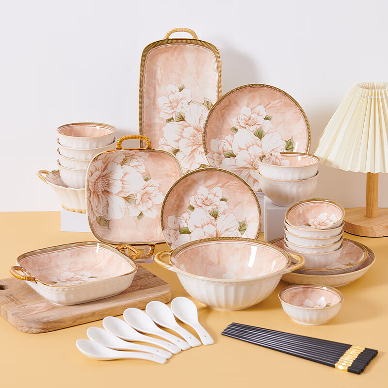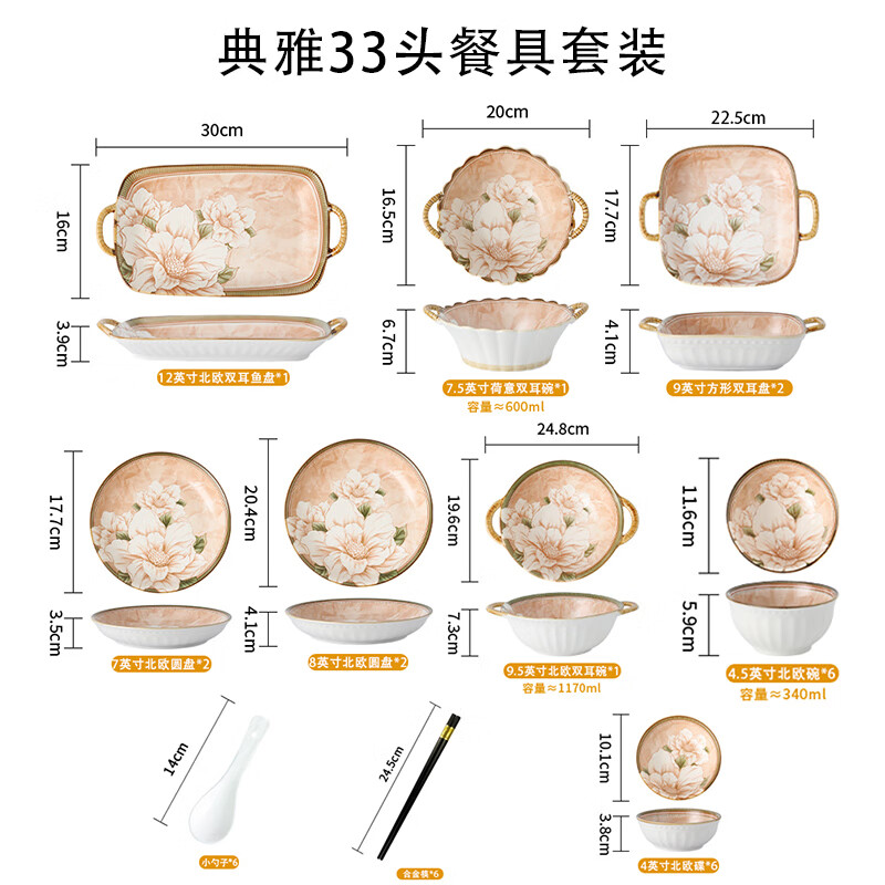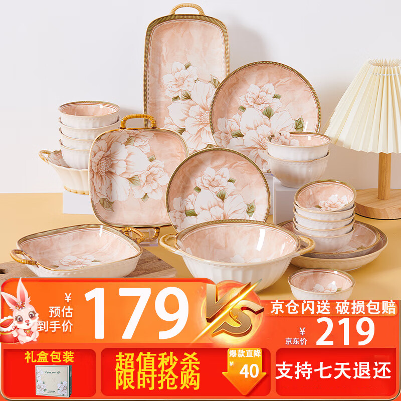 唯铭诺(WEIMINGNUO)陶瓷碗碟套装家用釉下彩碗盘餐具套装乔迁送礼山茶花33头礼盒装价格:219.00元!