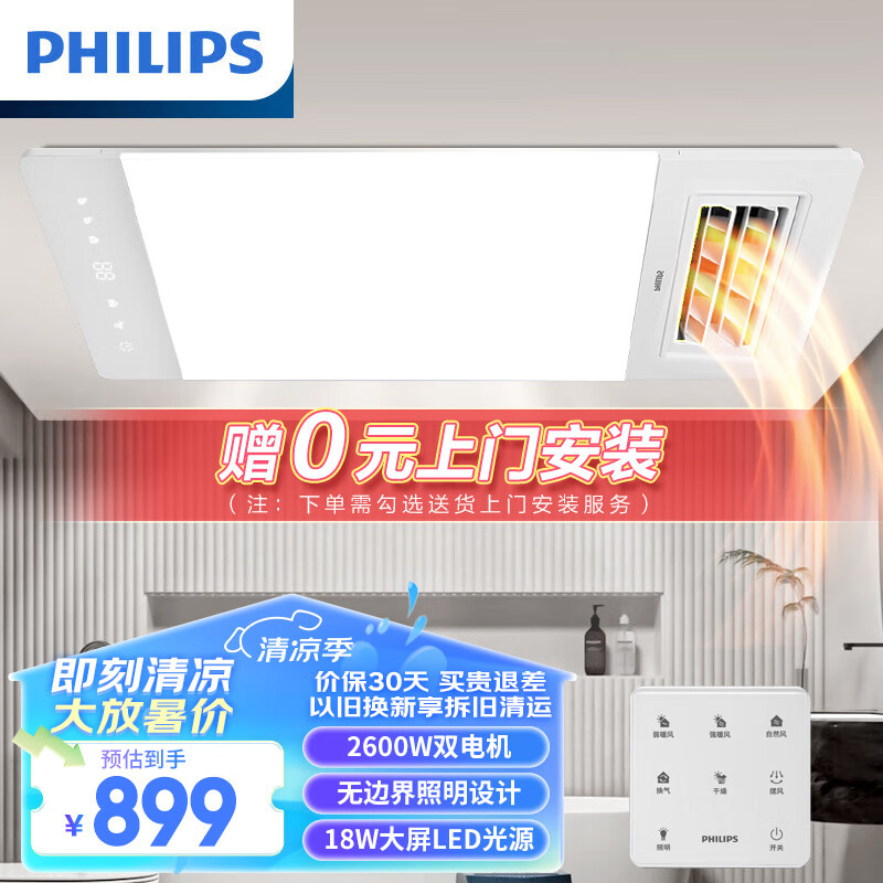 飞利浦(PHILIPS)M3浴霸2600W双核暖风排气扇照明一体 集成吊顶卫生间浴室暖风机价格:989.00元!