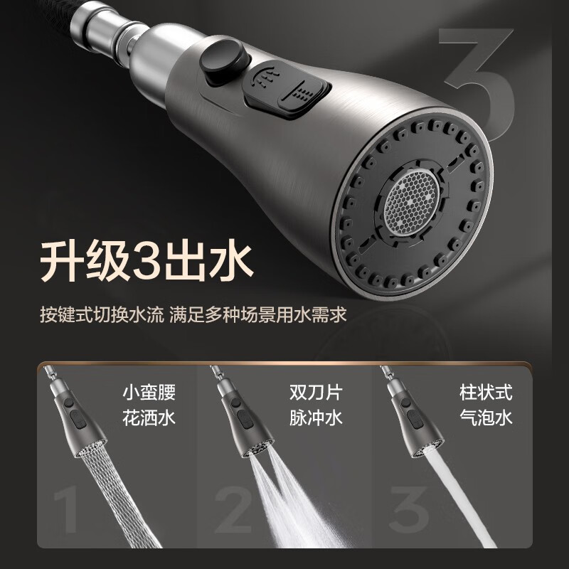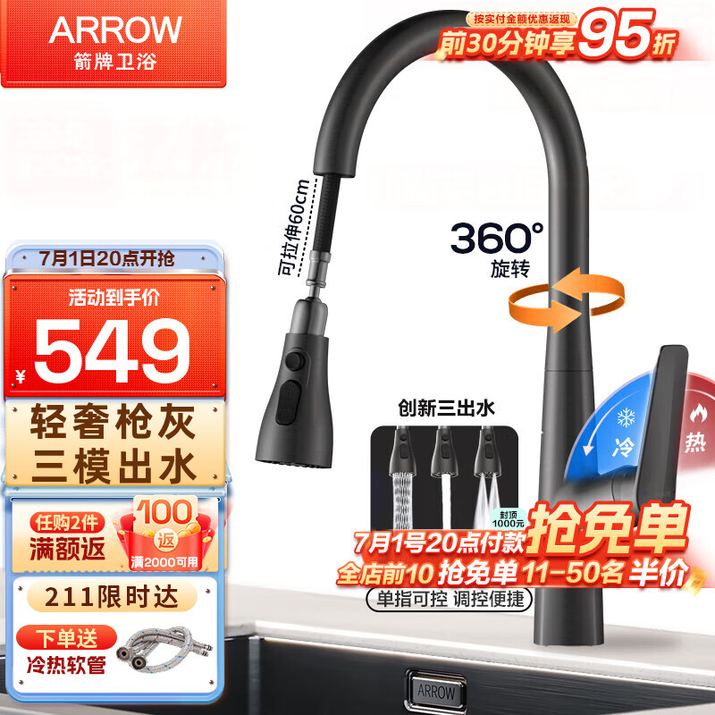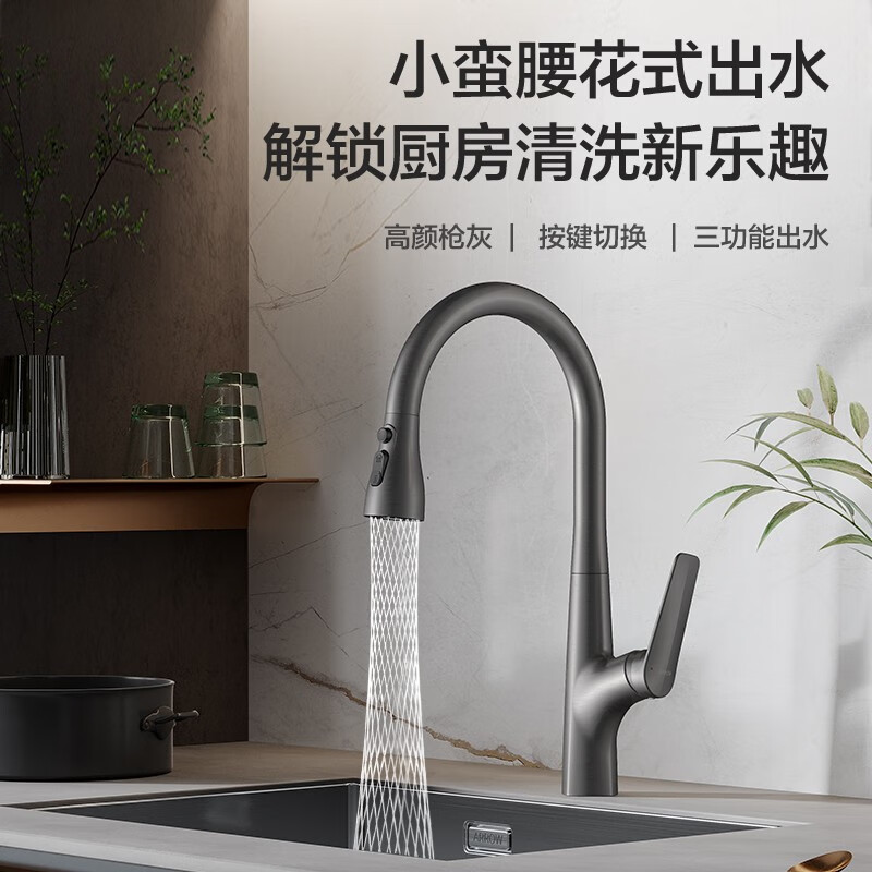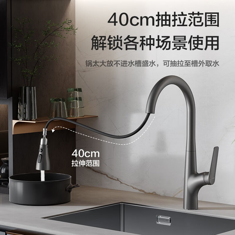 箭牌(ARROW)家用旋转式厨房水龙头抽拉式洗菜盆洗碗池伸缩冷热防溅单把龙头 【枪灰色】三功能抽拉龙头价格:649.00元!