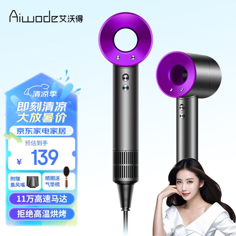 艾沃得(Ai wo de)吹风机家用新一代电吹风筒大功率高速吹风机1600W大风力11万转速干低噪音便携无叶 亮紫色 【护发发廊家用】价格:139.00元!