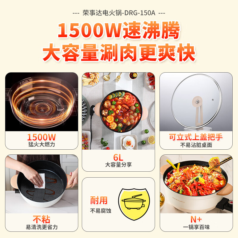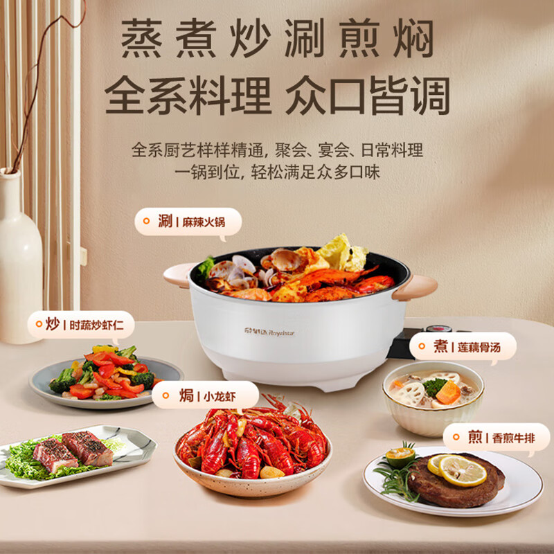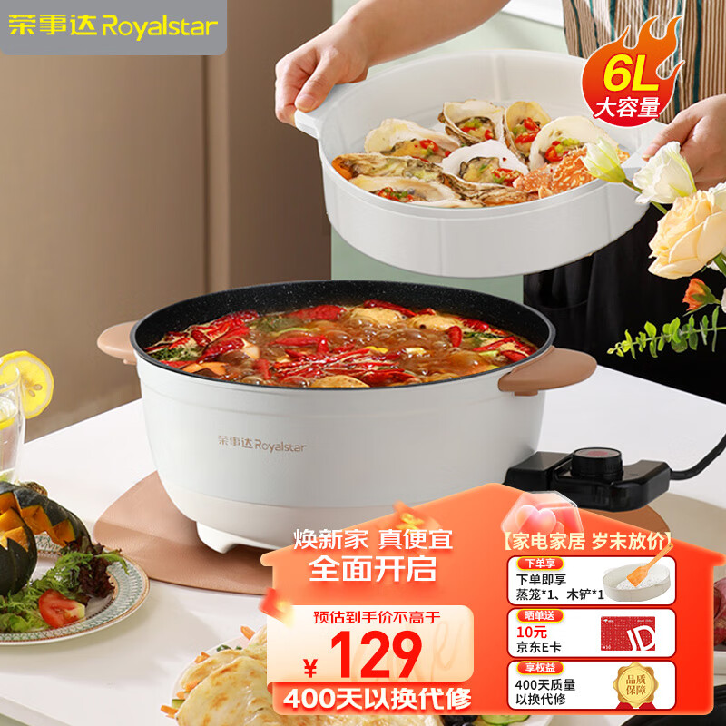 荣事达(Royalstar)电火锅 电炒锅 电煮锅 电锅一体 电热锅多功能多用途锅家用烤肉涮火锅锅具6L火锅DRG-150A配蒸笼价格:129.00元!