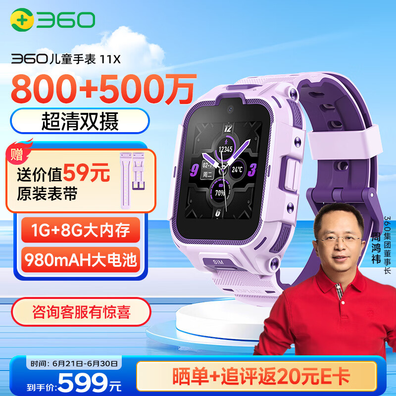 360儿童电话手表11X六一儿童节礼物高清双摄儿童GPS定位手表超长续航4G通视频通话手表男女香芋紫价格:599.00元!
