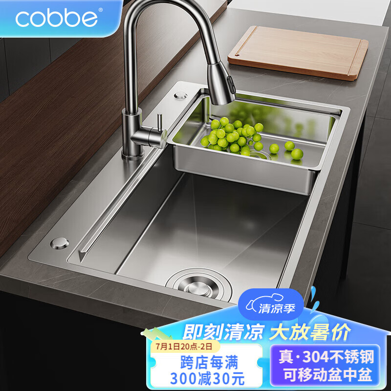 卡贝(cobbe)304不锈钢水槽手工大单槽厨房洗手洗菜盆家用台上盆淘菜洗碗水池价格:758.00元!