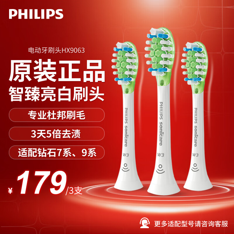 飞利浦(PHILIPS) 电动牙刷头替换头钻石系列适配HX9924HX9903HX9911HX9912HX9954HX9924 白色亮白型装HX9063/67 3支价格:209.00元!