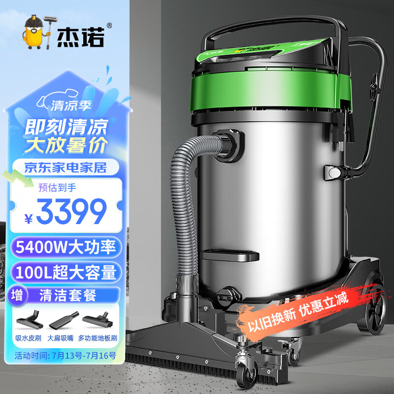 杰诺5400W大功率强大吸力干湿两用商用工业吸尘器工厂车间大型厂房粉尘吸水机JN-301T边推边吸价格:3399.00元!